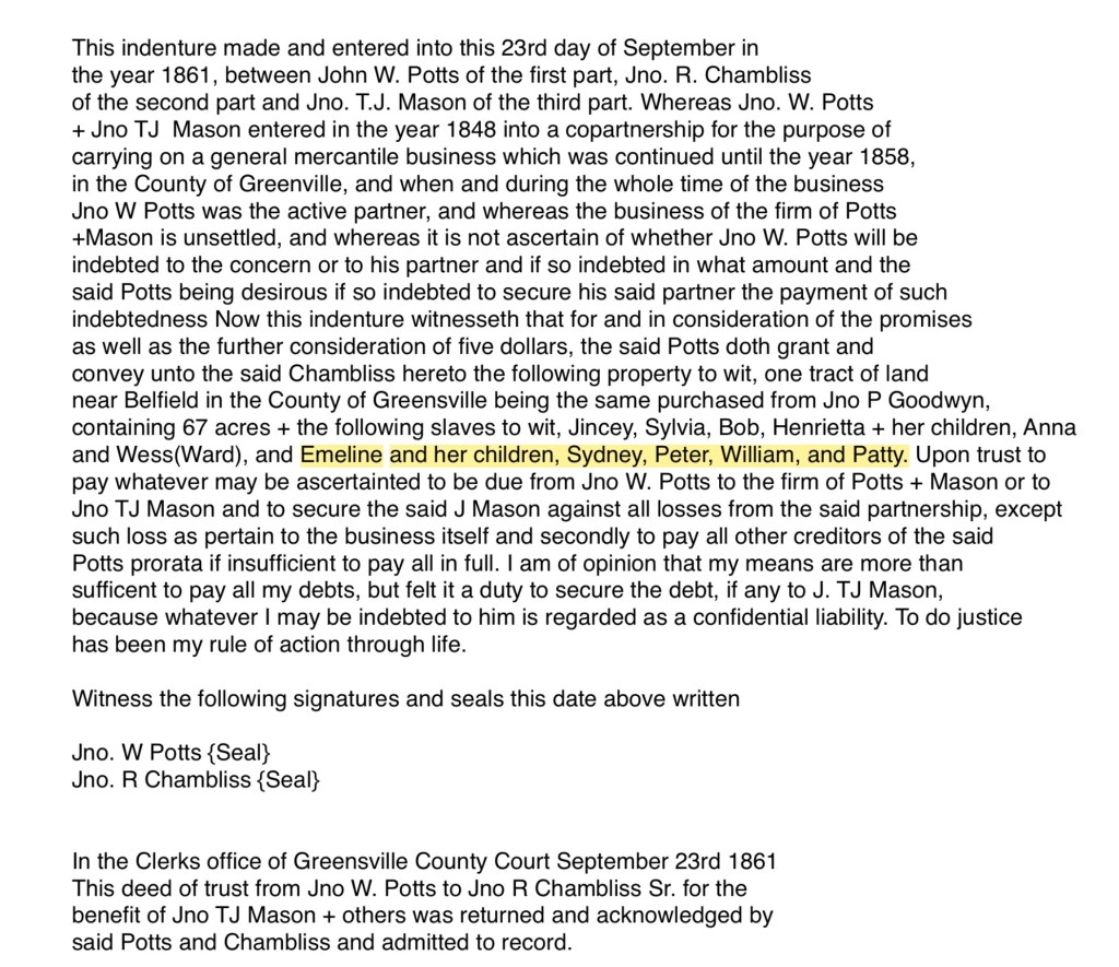 This document also crystallizes the desperation of Potts to salvage his “good name,” in terms of running in front of a debt that was steamrolling its way to him. Potts was willing to throw everything short of the kitchen sink to save his name. Never mind that his probable kin through unspeakable acts and her little ones were literally collateral damage. These souls were nothing more than pawns in a failed attempt to thwart the realities of a failed business venture.