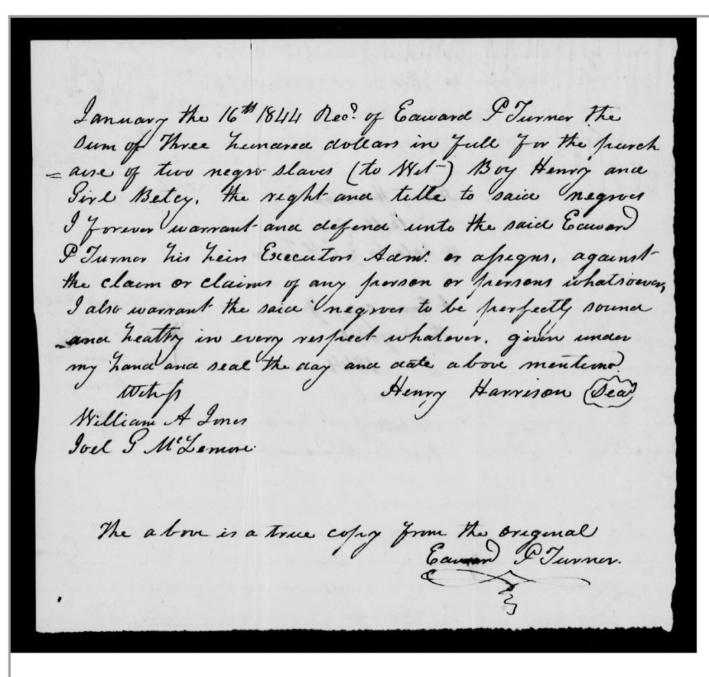 January the 16th 1844 Recd of Edward P. Turner the sum of Three Hundred dollars in full for the purchase of two negro slaves (to wit) Boy Henry and Girl Betcy. The right and title to said negroes I forever warrant and defend unto the said Edward P. Turner his heirs Executors Adm. or assigns againt the claims of any person or persons whatsoever, I also warrant the said negroes to be perfectly sound and healthy in every respect whatever. given under my hand and seal the day and date above mentioned.