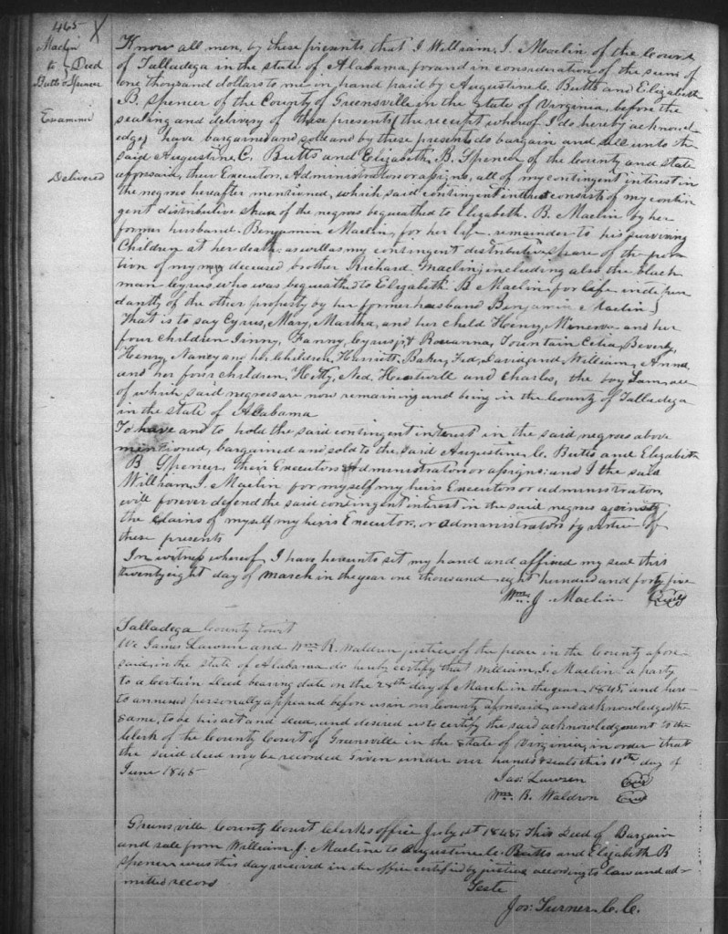 Know all men by these presents that I William J. Maclin of the county of Talledega in the state of Alabama for and in consideration of the sum of one thousand dollars to me in hand paid by Augustine C. Butts and Elizabeth B. Spencer of the county of Greensville in the state of Virginia before the sealing and delivery of these presently the receipts whereof I do hereby acknowledge have bargained and sold and by these presents do bargain and sell unto the said Augustine C. Butts answer Elizabeth B. Spencer of the county and state aforesaid, their Executors, Administration or assigns, all of my contingent interest in the negroes hereafter mentioned, which said contingent interest consists of my contingent distributive share of the negroes bequeathed to Elizabeth B. Maclin by her former husband Benjamin Maclin, for for her life remainder to his surviving children at her death as well as my contingent distributive share of the portion of my deceased brother Richard Maclin, including also the black man Cyrus who was bequeathed to Elizabeth B. Maclin for life independent of the other property by her former husband Benjamin Maclin, that is to say Cyrus, Mary, Martha, and her child Henry, Minerva and her four children Jinny, Fanny, Cyrus, + Roxanna, Fountain, Celia, Beverly, Henry Nancy and her children, Harriett, Baker, aged, David, and William, Anna, and her four children, Hetty, Ned, Hesturll and Charles, the boy Sam, all of which said negroes are now remaining and being in the county of Talledega in the state of Alabama