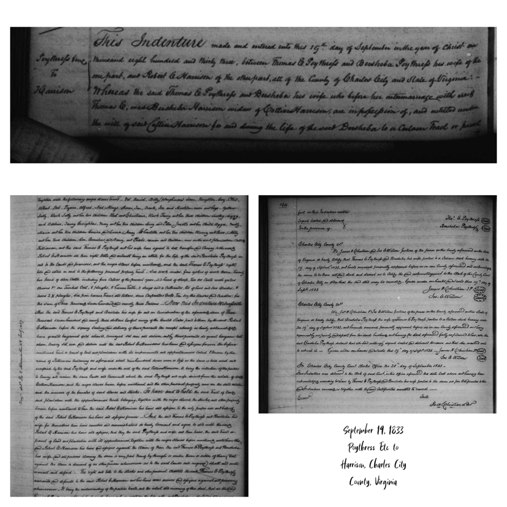 This Indenture made and entered into this 19th day of September in the year of Christ one thousand eight hundred and thirty three, between Thomas E Poythress and Bersheba Poythress his wife of the one part, and Robert C Harrison of the other part, all of the County of Charles City and State of Virginia:—Whereas the said Thomas E Poythress and Bersheba his wife who before her intermarriage with said Thomas E, was Bersheba Harrison widow of Collier Harrison, are in possession of, and entitled under the will of said Collier Harrison for and during the life of the said Bersheba to a certain tract or parcel of land and plantation situate lying and being in the said County of Charles City on Kittewan Creek, called and known by the name of Kittiewan, containing by estimation with the lands attached to, and used and occupied therewith nine hundred acres more or less, with the improvements and appurtenances thereunto belonging together with the following negro slaves to wit—- Vol, David, Billy (ploughman Sam, Kingston, Coy, Phil, Albert, Bob, Pizano, Alfred, Ned, Alonzo, Aaron, Tom, Frank, Joe and Macklin, men and boys—-yellow Sally, black Sally and her two children Hal and Christiana, black Fanny and her three children Suckey, Siggy, and Adeline, Fanny Creighton, Mary and her two children Lucy and Peter. Jenette and her child Agga, Milly, Maria and her two children Louisa and Laura, Amey Charlotte and her two children Winney and Rose, Abby and her three children, Len, Cornelius and Nancy, and Phebe, women and children, now on the said plantation called Kittiewan, and the said Thomas E Poythress and his wife have agreed to the sell transfer and convey the said Robert C Harrison all their right tittle (sic) and interest being an state for the life of the said Bersheba Poythress in and to the lands and promeses (sic), and the negro slaves before mentioned, and the said Thomas E Poythress’ right telle and estate in and to the following personal property to wit—-six work mules, four yolks of work oxen, twenty two head of other cattle including five calves of the present year, 42 head of sheep, two ox carts with yokes chains + one one Tumbrel cart, 8 ploughs, 8 harrow teeth, 2 drags and a cultivator, lot of hoes and two spades, 8 axes 2 X ploughs, six pair harness, Traces, and collars, some Carpenters tools, ten scythe blades and cradles; for the sum of Three thousand seven hundred and ninety three Dollars—-Now this Indenture Witnesseth that the said Thomas E Poythress and Bersheba his wife for and in consideration of the aforesaid sum of of Three thousand seven hundred and ninety three dollars lawful money of the United States paid to them by the said Robert C Harrison before the signing sealing and delivery of these presents the receipt thereof is hereby acknowledged have granted bargained sold aliened, conveyed sel (sic) over and deliver, and by these presents do grant bargain sell alien, convey set, over and deliver unto the said Robert C Harrisons his heirs and assigns forever the before mentioned tract or parcel of land and plantation with its improvements and appurtenances called + known by the name of Kittiewan containing as aforesaid about nine hundred acres more or less as the same is held used and occupied by the said Poythress and wife under the will of the said Collier Harrison, it being the intention of the parties to convey and receive the same lands and tenements which the said Poythress and wife derived from the estate of said Collier Harrison, and the negro slaves herein before mentioned and the other personal property now on the said estate and the increase of the females of the said slaves and stocks—To have and to hold the said Tract of land and plantation with the appurtenances thereto belonging, together with the negro slaves, the stocks, and other property herein before mentioned to him the said Robert C Harrison his heirs and assigns, to the only proper use and behest (?) of the said Robert C Harrison his heirs and assigns forever——And the said Thomas E Poythress and Bersheba his wife for themselves their heirs executors and administrations do hereby covenant and agree to and with the said Robert C Harrison his heirs and assigns, that they the said Poythress and wife and their heirs, the said Tract or parcel of land and plantation with his appurtenances, together with the negro slaves before mentioned unto him the said Robert C Harrison his heirs and assigns agains the claim of them the said Thomas E Poythress and Bersheba his wife and all persons claiming the same or any part thereof by through or under these or either of them (to wit against the claim or demand of no other person whomsoever as to the said lands and negroes shall and will warrant and defend——.The right and telle to the stocks and other personal chattels the said Thomas E Poythress warrants and defends tot he said Robert C Harrison and his heirs exrs. admrs and assigns against all persons whomsoever—It being the understanding of the parties hereto, and the intent and meaning of this deed, that as the said Thomas E Poythress and Bersheba his wife have only an estate for the life of the said Bersheba in the lands and negroes aforesaid, they are to convey such estate only as they have therein and may lawfully part withal——-In Witness whereof and of all these presents the said Thomas E Poythress and Bersheba Poythress his wife have hereunto set their hands and affected their seals the day and date