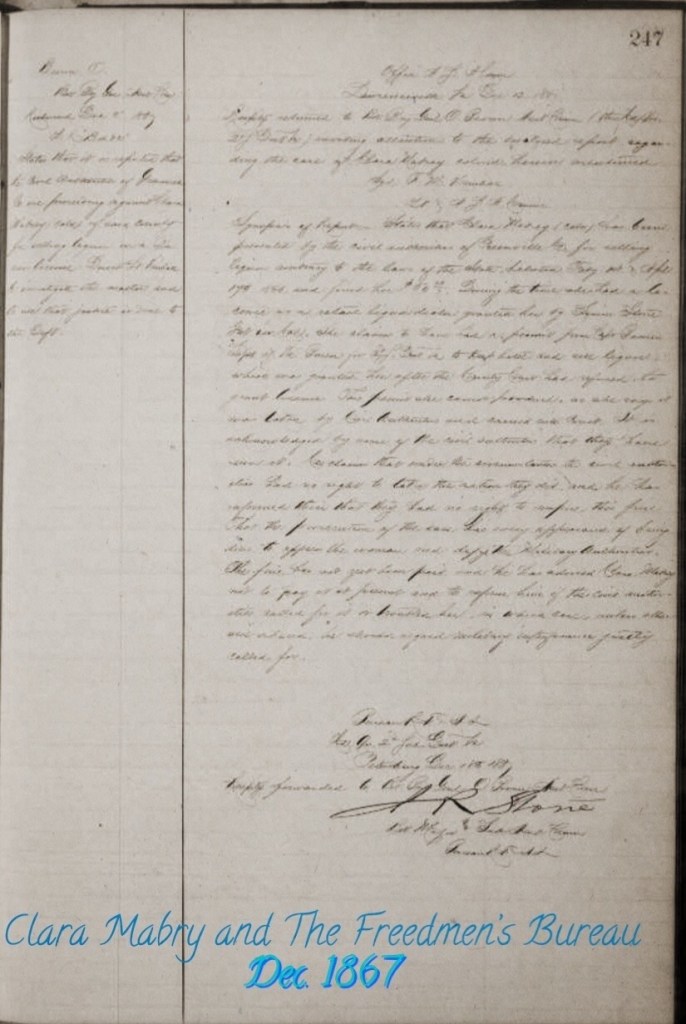 Herewith a report which…from this office to the 2nd …Mil Dist under note of Dec 9 1867 regarding the case of CLARA MABRY colored who was prosecuted + fined by the civil authorities for selling liquor without license, …attention to the endorsement of Gen Schofield thereon requiring further information as to the date under which CLARA MABRY applied for her license when she applied, also further evidence as to the matter of her …+ Bureau license etc. This evidence find enclosed herewith. Said CLARA MABRY applied to the County Court of Greensville Feby 5, 1866. The next day she went to Petersburg + obtained a written permit to keep a hotel from Capt Barnes. JW Potts Esq Clerk of Greensville Co Court is evidence of the fact that CLARA MABRY had such a letter as he says that he saw it. This additional report will …on you (SJohnson) as Mil. Com. All the necessary facts herewith forwarded enclosed.