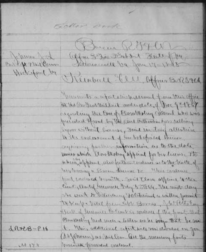 Referring to the second case allotted to the commission of Peter K Jones (herewith returned) stating that CLARA MABRY colored is being prosecuted by the civil authorities for selling liquor under a license from the Bureau, reports that he (Lt Kimball) he’s carefully investigated the matter + finds that the said CLARA MABRY has been presented + find fifty -50- dollars for selling (as the civil authorities claim) liquor contrary to the laws of the state. Finds after the investigation that she had a United States license granted by Simone Stone Int. Rev. Collector Petersburg Va and also a written permit from Capt Stewart Barnes then Supt 2nd Sub Dist Va. to keep a hotel or sell liquor which was given after the county court refused to grant her license, I have informed the civil authorities that I do not consider that they had any right under the circumstances to prosecute this woman whether she had sufficient authority or not, for she …under it in good faith. Consider the prosecution presented only by a spirit to oppress this poor woman to edify the military. The fine not as yet paid advise the said CLARA MABRY not to pay it at present but to inform his (Lt Kimball) at once if they attempt to collect it or disturbs her further in the matter. Regards the case in for military interference if necessity requires.