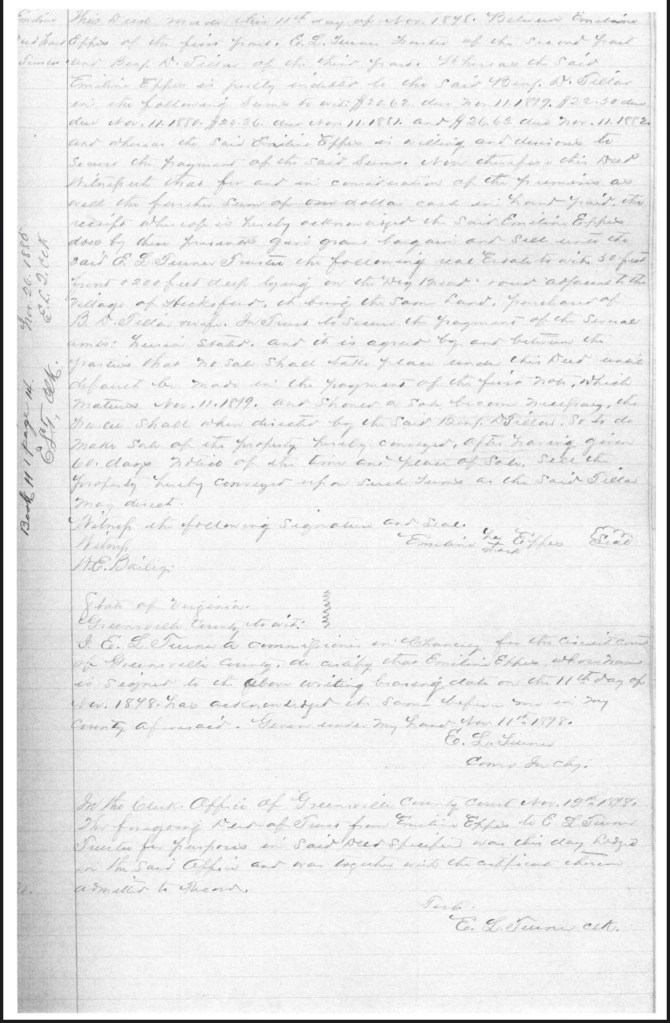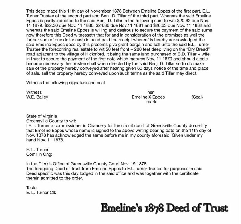 A number of years ago, a fellow descendant of Emeline Potts Eppes located an 1878 deed of trust for Emeline in the Greensville County, Virginia courthouse.