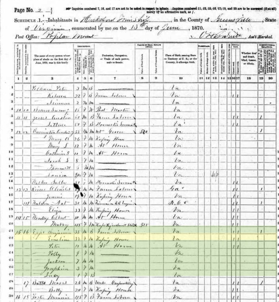 By 1878, Emeline had been in a relationship with Benjamin Eppes for a number of years. They appeared together, along with five children, including my 3rd great-grandmother, Josephine, in the 1870 U.S. Census.