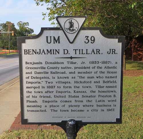 In 1992, the Virginia Department of Historic Resources wrote: Benjamin Donaldson Tillar, Jr. (1853-1887), a Greensville County native, president of the Atlantic and Danville Railroad, and member of the House of Delegates, is known as “the man who named Emporia.” Two villages, Hicksford and Belfield, merged in 1887 to form the town.