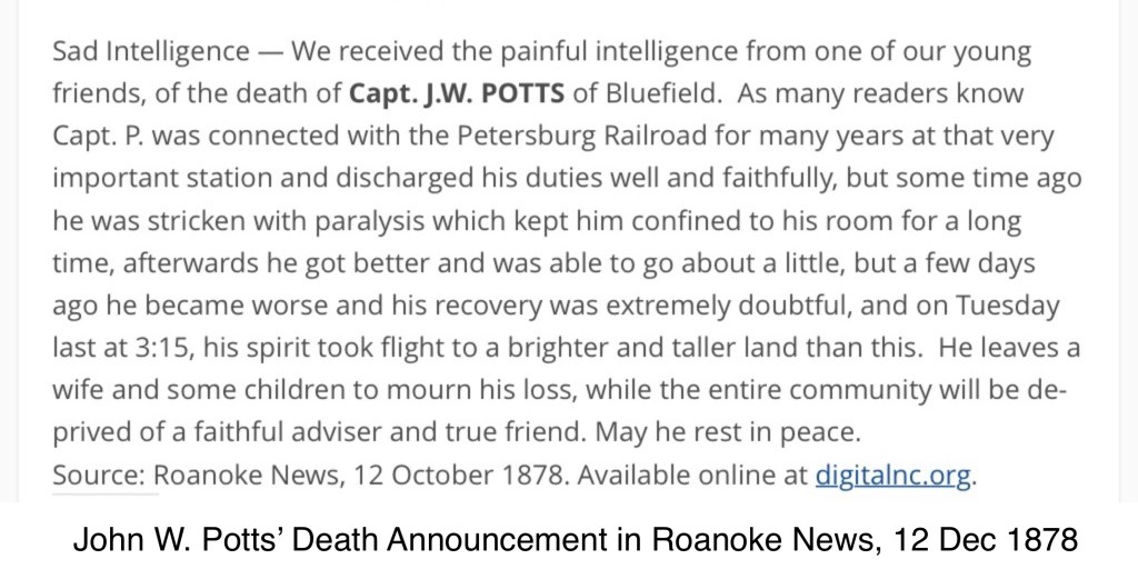 How was it that Emeline was in such association with such prominent men? This is speculation, but I do believe that Emeline’s relative was Clara Mabry. Mabry herself had previously received deeds of trust from “the benevolent gentlemen” of Greensville County. I also believe that Emeline was a blood relative (daughter?) of John W. Potts. The man who had held her and her children enslaved. Potts had passed away just a few weeks after Emeline’s 11 Nov 1878 deed of trust. Coincidence or not? I find the timing interesting either way.