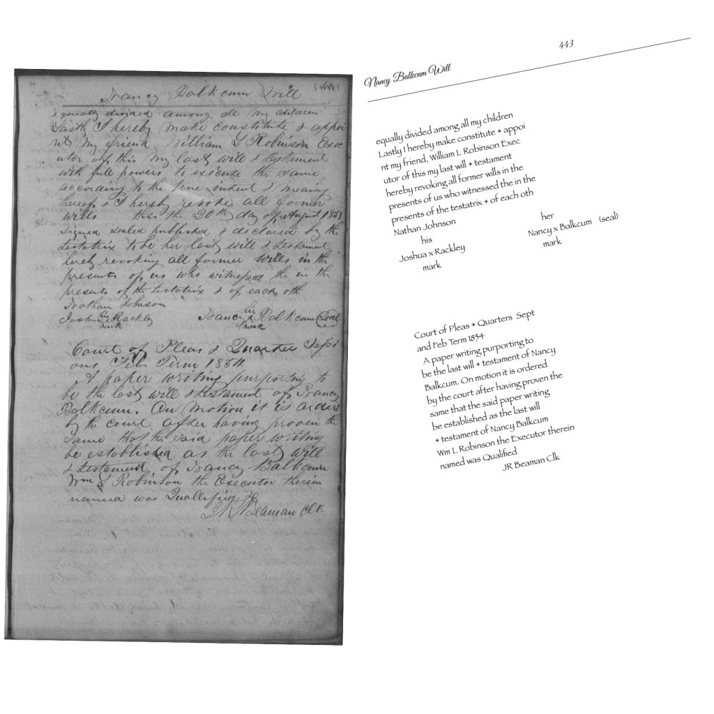 Nancy Balkcum was born about 1805 in North Carolina. She was the daughter of Hester Balkcum, but not the daughter of Hester’s husband, John Balkcom (d.1803). Nancy’s sister was Mariah Balkcum. Though neither Mariah nor Nancy was a child of John, they did receive the Balkcum surname.*