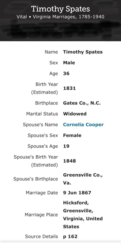 The answer was delivered in the form of an 1867 marriage record, between a widowed Timothy Spates and his young bride, Cornelia Cooper.