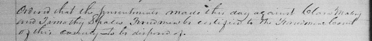 Ordered that the presentments made this day against Clara Mabry and Timothy Spates Freedmen be certified to The Freedmen’s Court of this County to be disposed of.