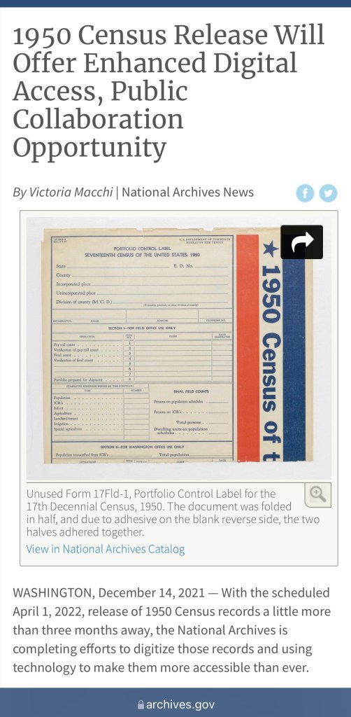 On April 1, 2022, the National Archives will release the 1950 U.S. Census. This is a landmark event for many everyday folk, historians, genealogists, and any other “ologist” you can think of.