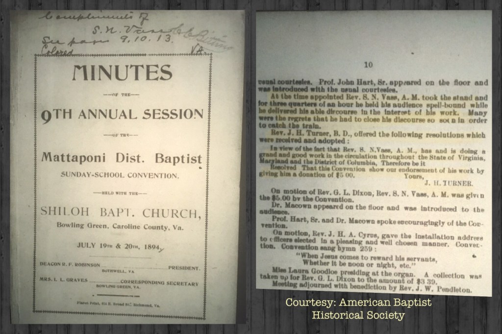 Rev. Vass was a missionary, like my forebear, Rev. John H. Turner, B.D. (b. 1854, in Southampton County, VA). In working with the American Publication Society, Mattaponi District Baptist Sunday-School Convention, and the Virginia Baptist State Sunday School Convention, Rev. Vass was closely connected to my 3rd great-grandfather, Rev. John H. Turner.