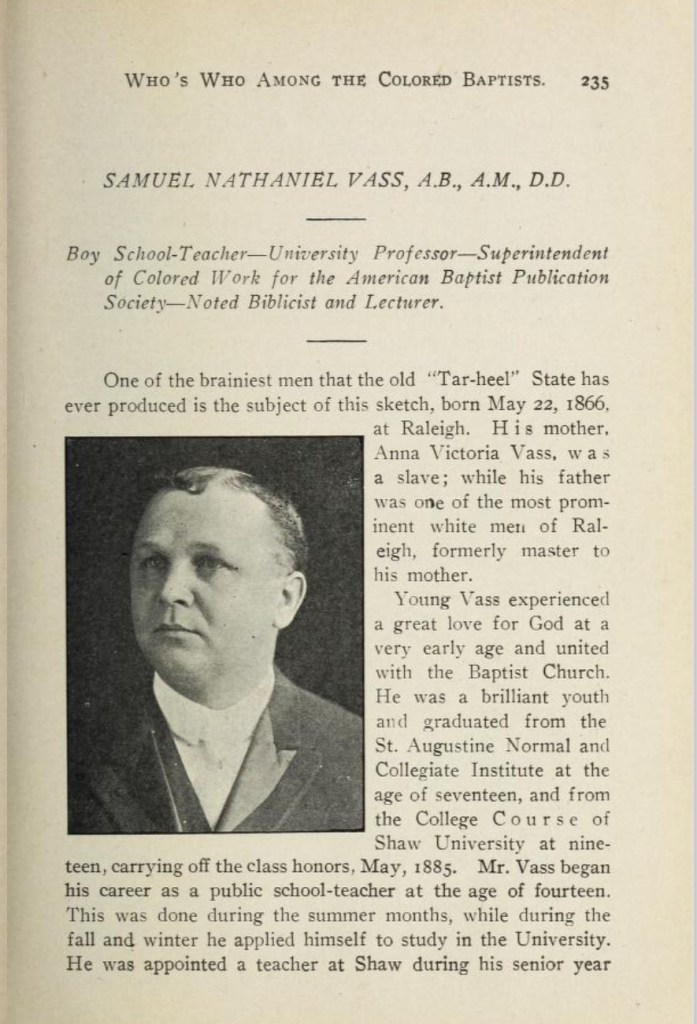 Rev. Vass’ biography is written in, Who’s Who Among the Colored Baptists (1913, Samuel William Bacote):