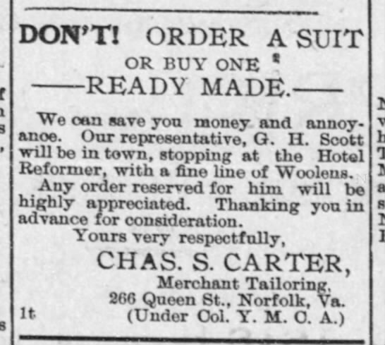 Charles S. Carter was operating a tailoring business by 1899 in Norfolk, according to the 1899 Norfolk City Directory