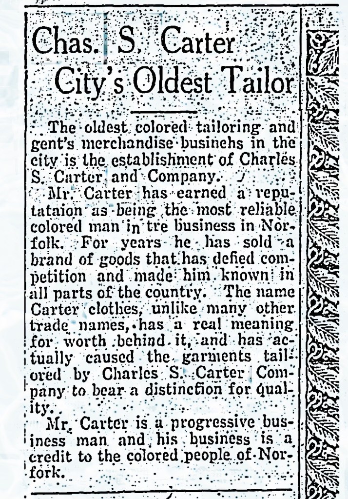 As early as 1899, Charles S. Carter’s tailoring business was listed in the Norfolk City Directory.