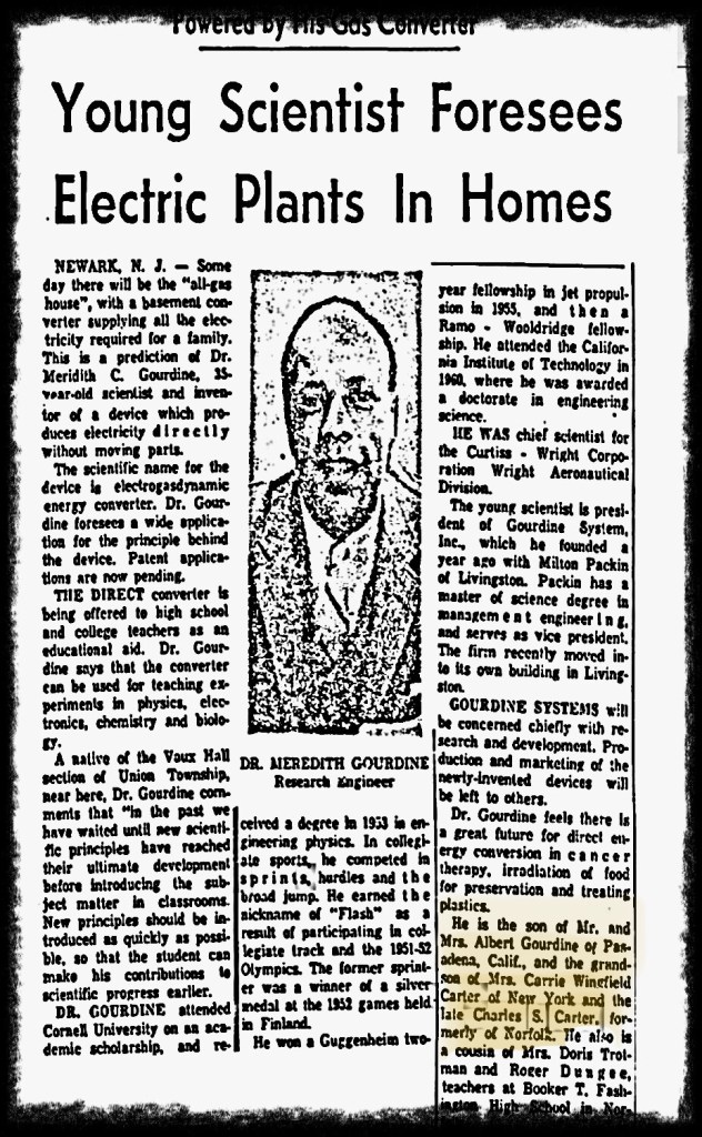 “Dr. Meredith C. Gourdine…He is the son of Mr. and Mrs. Albert Gourdine of Pasadena, Calif., and the grandson of Mrs. Carrie Wingfield Carter of New York and the late Charles S. Carter, formerly of Norfolk.” 27 May 1965