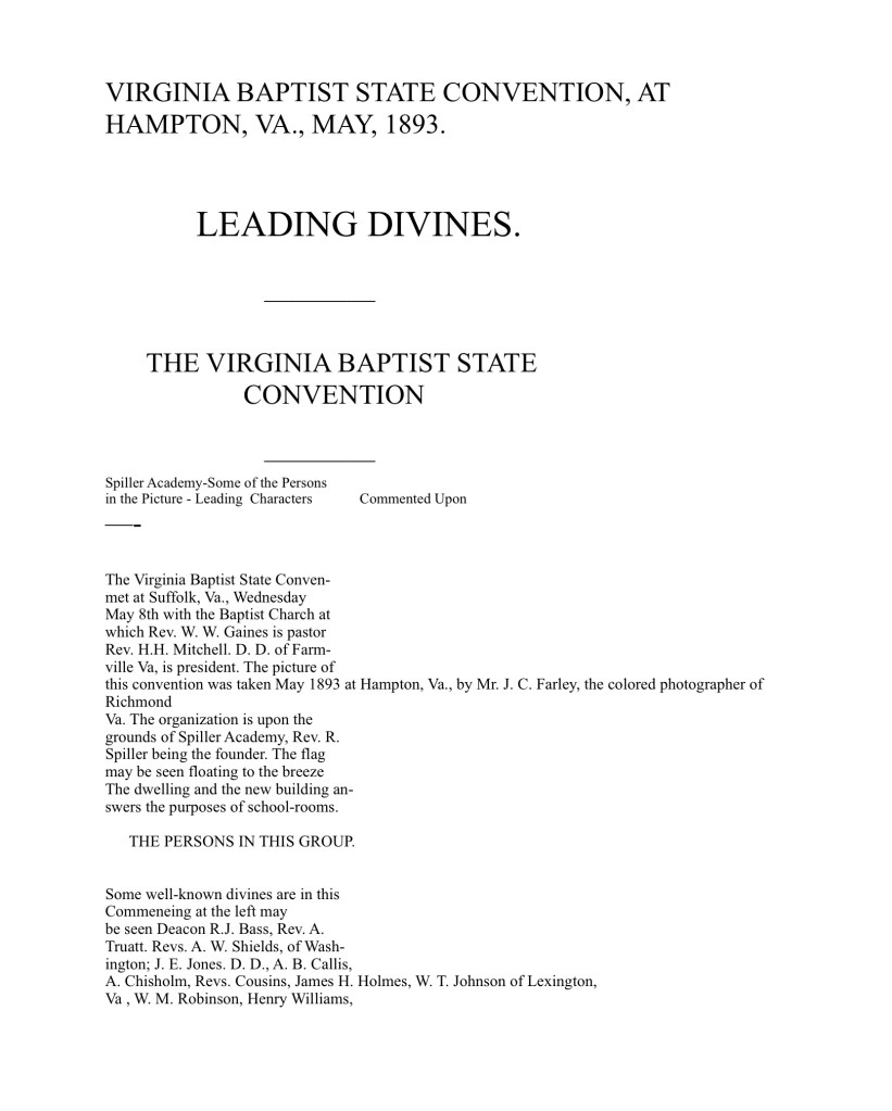 Here are links about some of the interesting subjects of the May 1893 Virginia Baptist State Convention in Hampton, Virginia: