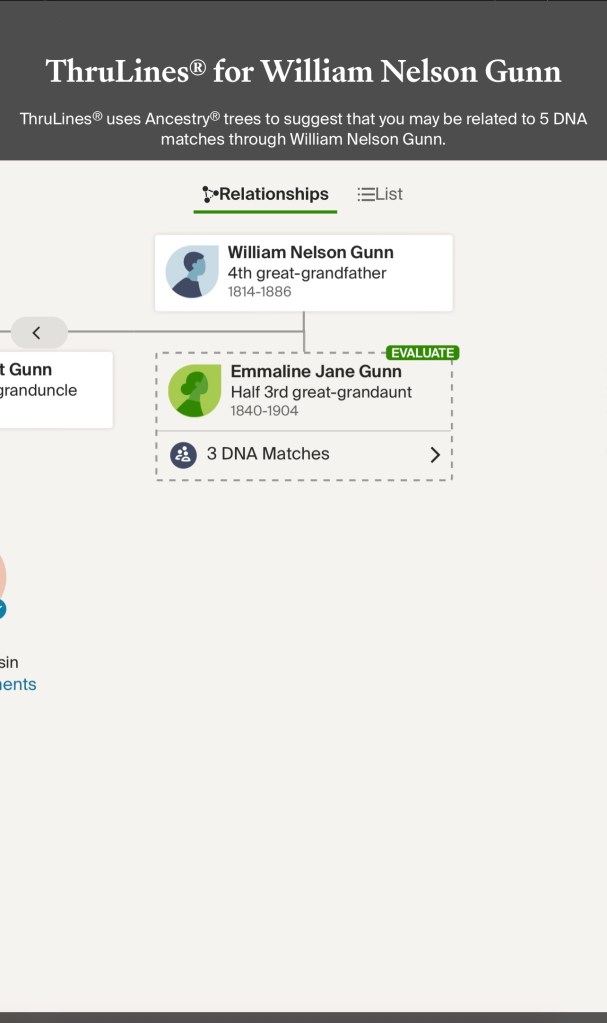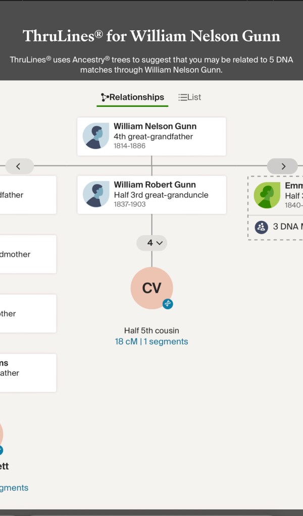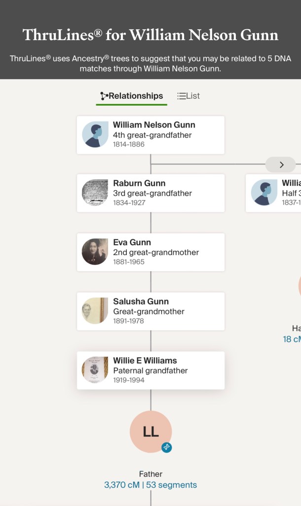 According to AncestryDNA ThruLines, it is suggested I (along with my father and sister) am connected to 5 DNA matches through William Nelson Gunn Jr.