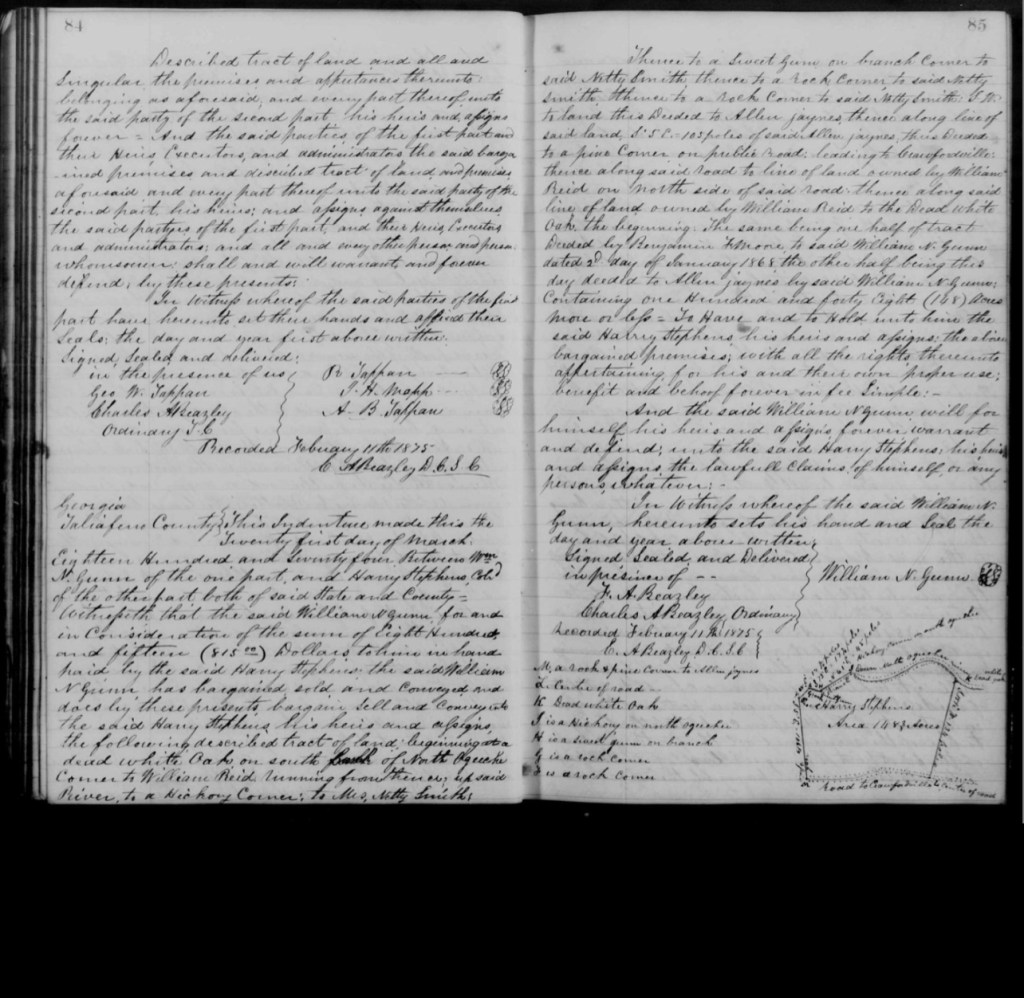Pages 84 & 85 of Taliaferro County, GA Deed Book G, showing the above-mentioned land sale.