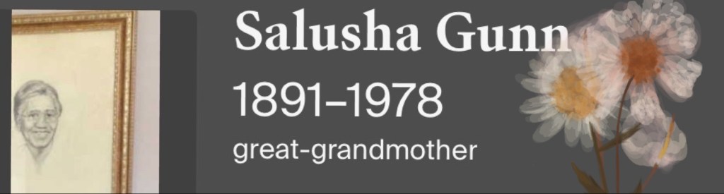 My father’s paternal grandmother was Salusha Williams, born Salusha Gunn in Crawfordville, Taliaferro County, GA.
