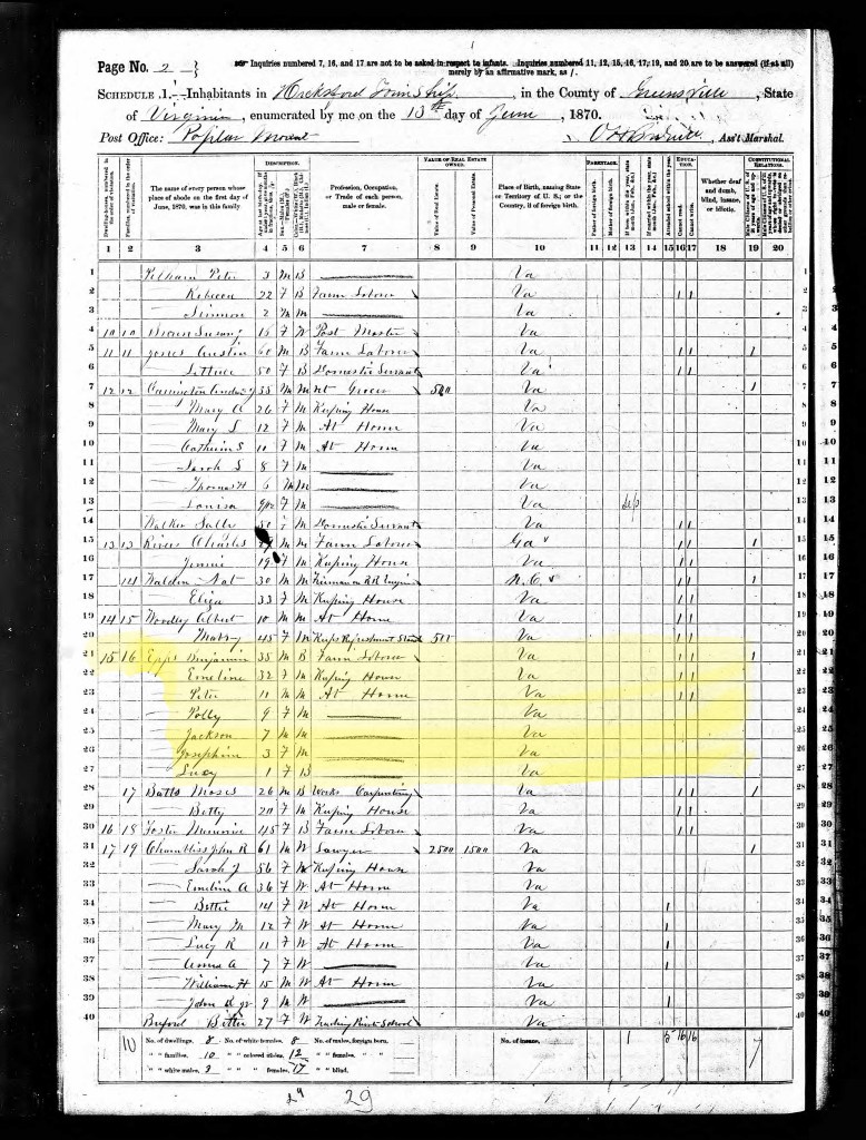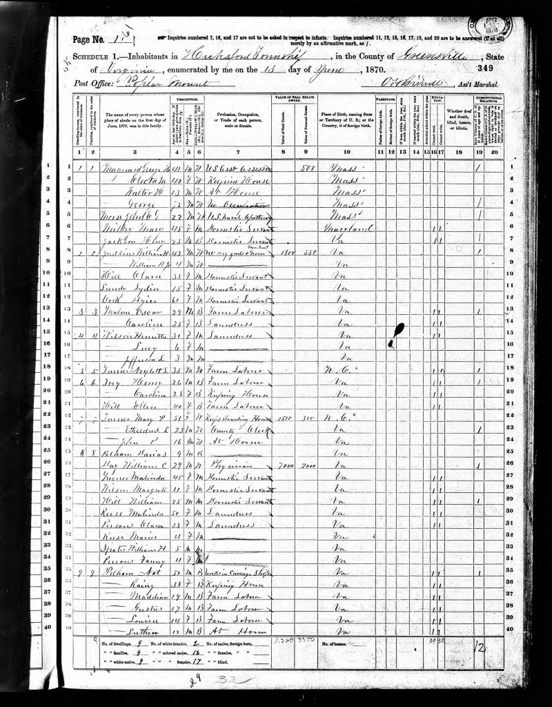 Household No. 8 is a literal motley crew of characters. For whatever reason, nine-year-old Darius Pelham’s name is listed first. Surely, he wasn’t the head of household. Next, Dr. William C. (Chilton) Day is enumerated. Dr. Day was a Confederate surgeon, in 1870, he was practicing medicine in Hicksford, Greensville County, Virginia. There are three other children listed, though one 10 year old, Margaret Wilson, is listed as a servant. Another child’s name, 5 year old William H. Spates, is a major clue about who these occupants really are.