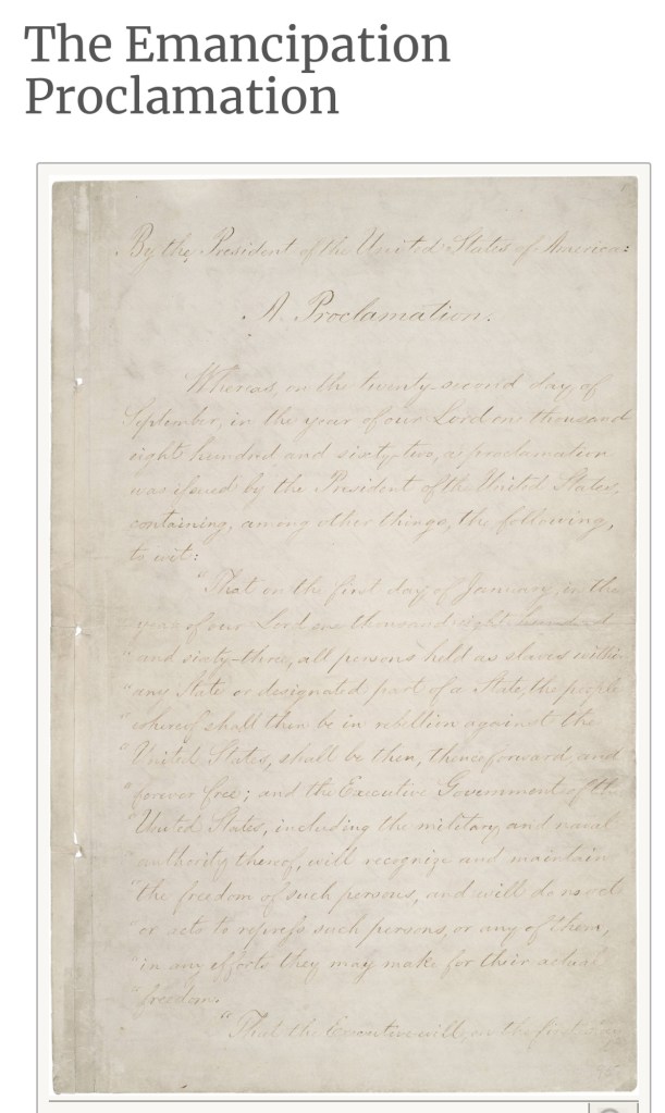 “President Abraham Lincoln issued the Emancipation Proclamation on January 1, 1863, as the nation approached its third year of bloody civil war. The proclamation declared ‘that all persons held as slaves’ within the rebellious states ‘are, and henceforward shall be free.’”