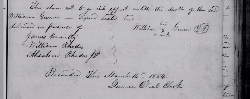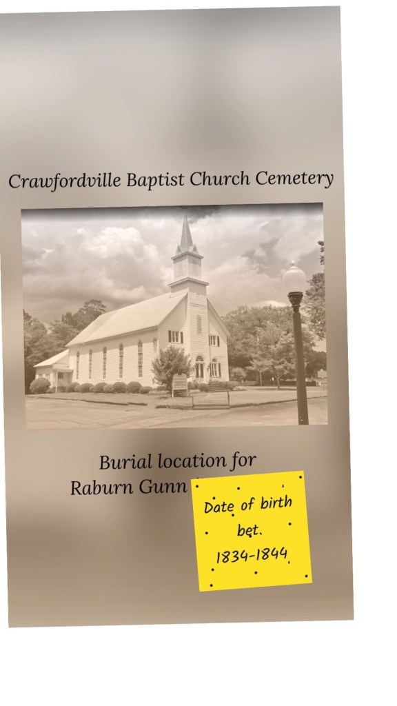 This deed documents that Raburn was gifted to John R. Gunn, genetically his half-brother—-culturally and legally, his warden—to remain until the end of chattel slavery. Raburn would be living next to three of John R. Gunn’s spinster daughters, according to the 1920 U.S. Federal Census. Even further, in 1927, Raburn was buried with these Gunns at Crawfordville Baptist Church Cemetery rather than with his wife and children and other kin at Friendship Baptist Church cemetery.