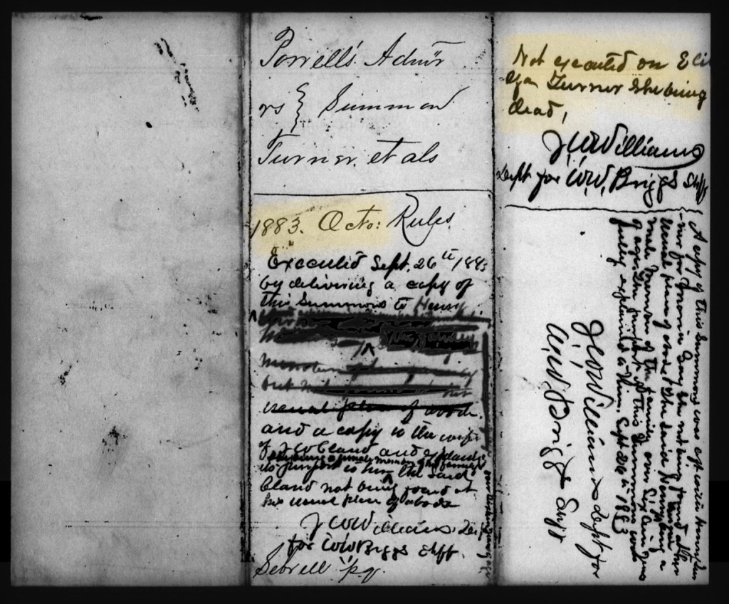 According to the summons notice, Henry was served, Maria was not at home, and Eliza had passed away. All things considered, it seems like the Southampton County Death Register record for Eliza Turner, DOD: June 12, 1883, indeed refers to my ancestor.