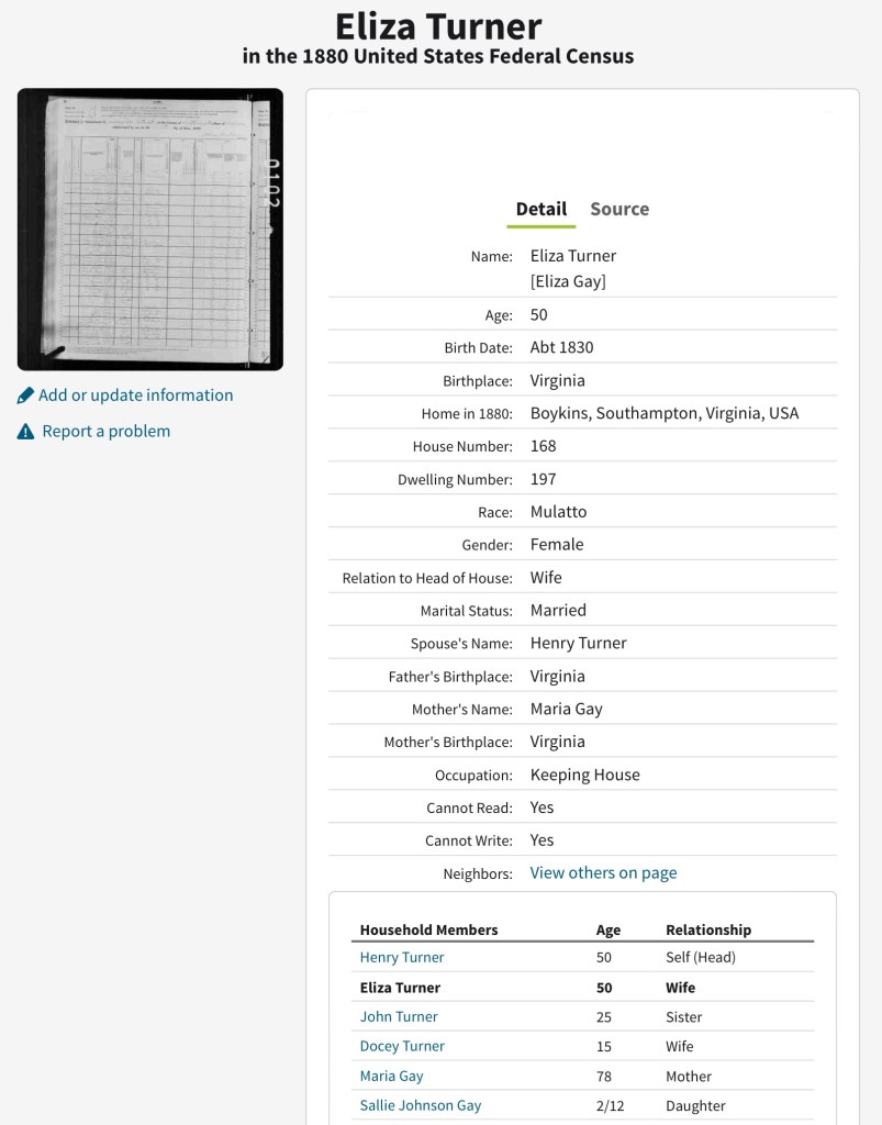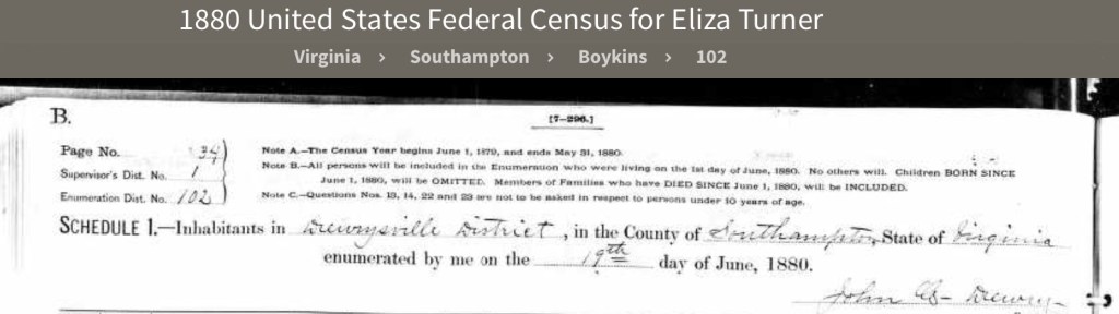 What I did know was that Eliza appeared in the 1880 U.S. Census and by 1886, a widowed Henry Turner had remarried to a certain Caroline Claud. In terms of verifying Eliza’s year of death, it would have had to have been between 1880 and 1886. The Southampton County Death Register date of June 12, 1883 is within that window.